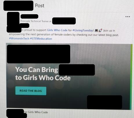 Eine Firma verkündet in ihrem Blog, dass sie stolz ist, die Aktion "Girls who Code" (Mädchen, die programmieren) zu unterstützen. Privat finanziert. | |
