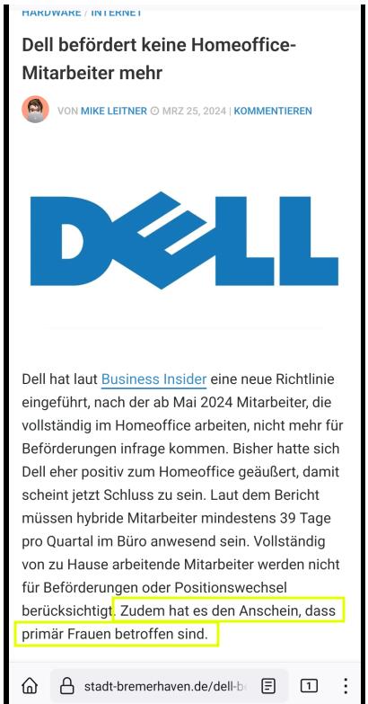 Im Blog-Artikel wird vermutet, dass primär Frauen von Dells neuer Homeoffice Regelung betroffen sind. Privat finanziert. | |