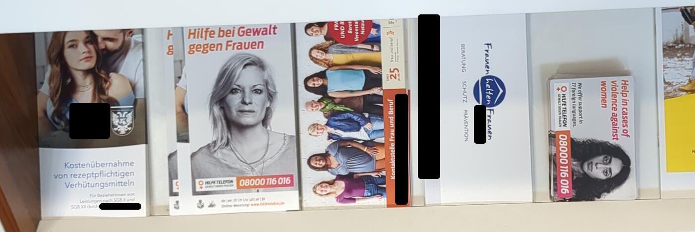 Flyer im Bürgerbüro, Hilfsangebote für Frauen: Staatlich finanziert. | |