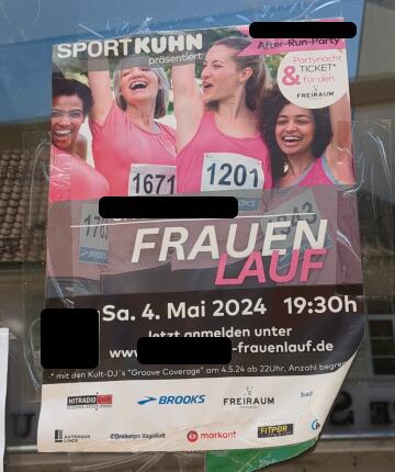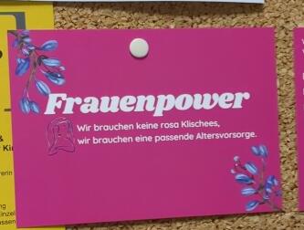 Eine Versicherung wirbt an der Pinnwand eines Fitnessstudios mit/für "Frauenpower". Privat finanziert. | |