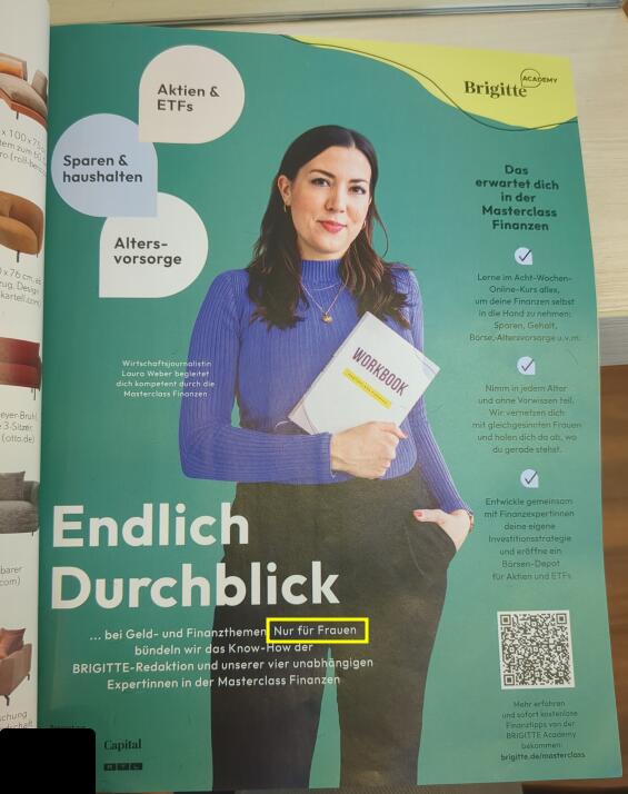 Werbung in einer Zeitschrift: Finanzkurse nur für Frauen bei der BRIGITTE Academy. Privat finanziert. | |