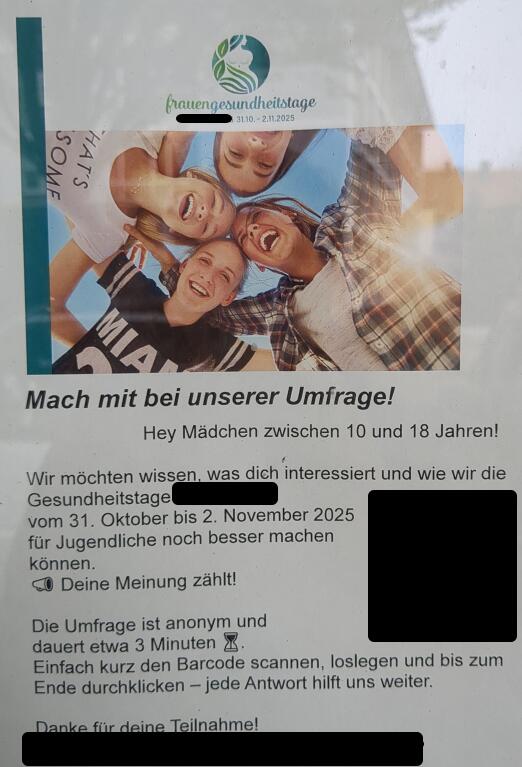 Junge Frauen werden befragt, wie die Frauengesundheitstage verbessert werden könnten. Vermutlich staatlich gefördert. | |