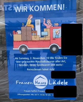 Zur Förderung des Frauenhauses wird ein Laden eröffnet. Vermutlich staatlich gefördert. | |