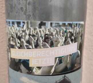 Ein Aufkleber an einer Straßenlaterne zeigt Frauen, die "Gleichberechtigung jetzt!" fordern. Privat finanziert. | |
