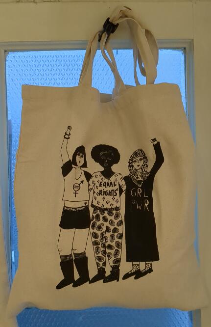 Frauen auf einer Stofftasche skandieren "Equal Rights" und "Girl Power". Privat finanziert. | |