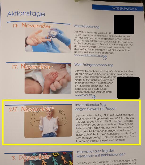 Eine Krankenkasse erinnert in einer Zeitschrift an den "Internationalen Tag gegen Gewalt an Frauen". Staatlich finanziert. | |