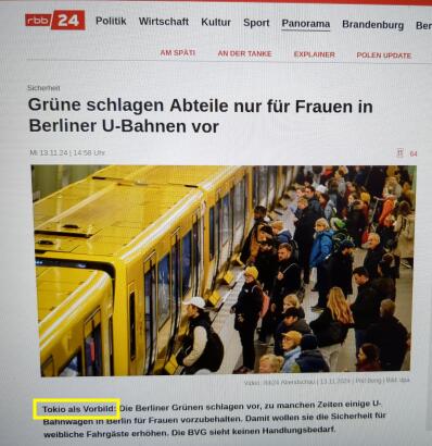 Medien berichten über einen Vorschlag der Grünen, U-Bahnwagen nur für Frauen einzuführen. Staatlich gefördert durch Parteienfinanzierung. | |