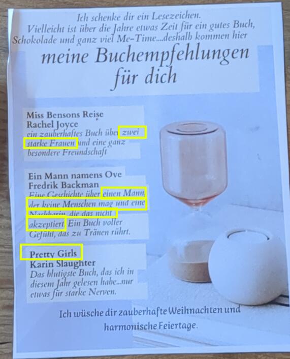 Drei Buchempfehlungen aus einem Adventskalender, der unter Freunden ausgetauscht wurde: Privat finanziert. | |