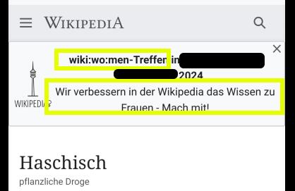 Einblendung beim Lesen eines Wikipedia Artikels. Die Frauen-Gruppe wiki:wo:men wirbt für die Teilnahme an einem Treffen. Staatlich gefördert. | |