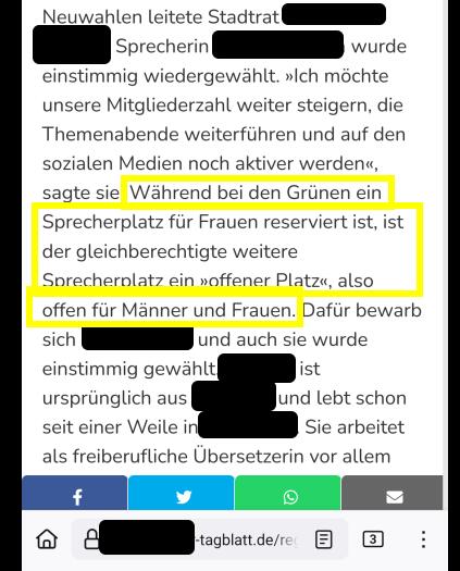 Bei den Grünen gibt es Posten, die exklusiv für Frauen reserviert sind. Und es gibt Posten, die durch Frauen oder Männer besetzbar sind. Staatlich gefördert durch Parteienfinanzierung. | |