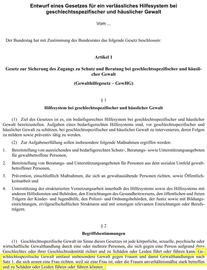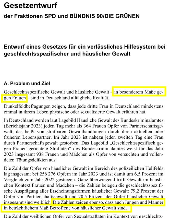 Bundestag beschließt ein Gesetzes für ein Hilfesystem bei geschlechtsspezifischer und häuslicher Gewalt. Aber nur bei Gewalt gegen Frauen. Staatlich finanziert. | |