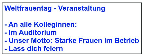 Auf einer Betriebsversammlung läd der Betriebsrat alle Frauen zu einer Feier zum Weltfrauentag ein. Privat finanziert. | |