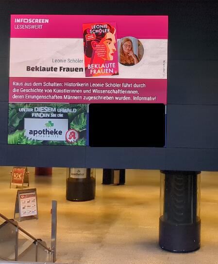 Ein Buch über beklaute Frauen wird am Eingang zur U-Bahn auf einer Videowand beworben. Privat finanziert. | |