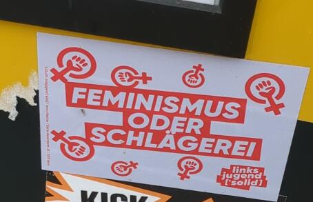 Ein Aufkleber auf einem Postkasten, der mit Gewalt droht, falls man nicht im Sinne des Feminismus handelt. Privat finanziert. | |
