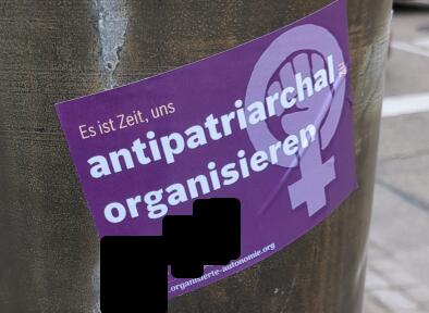 Ein Aufkleber auf einer Straßenlaterne, der dazu aufruft, dass sich die Gesellschaft antipatriarchal organisiert. Privat finanziert. | |