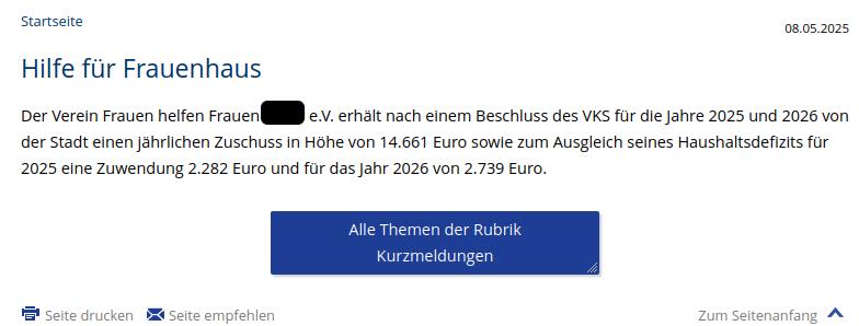 Ein Verein, der ausschließlich Frauen hilft bekommt von der Kommune eine jährliche Zuwendung. Das Haushaltsdefizit in den Jahren 2025 und 2026 wird durch zusätzliche Zuwendungen ausgeglichen. Staatlich finanziert. | |