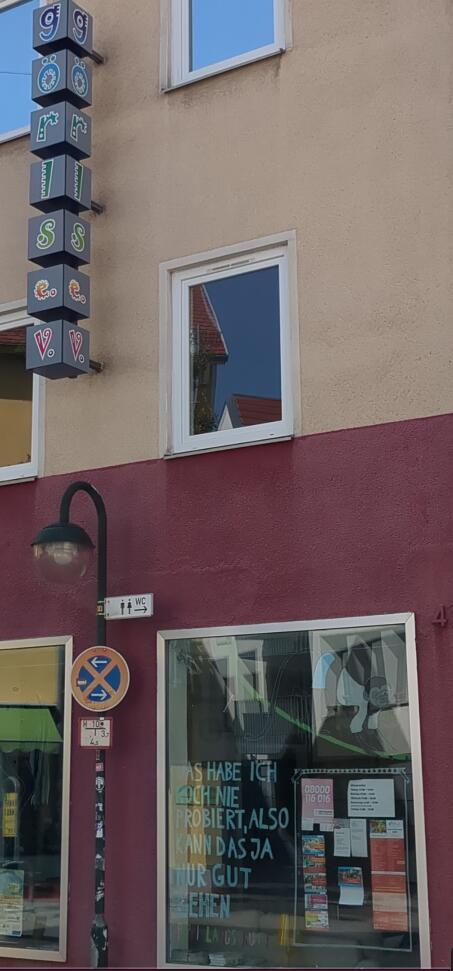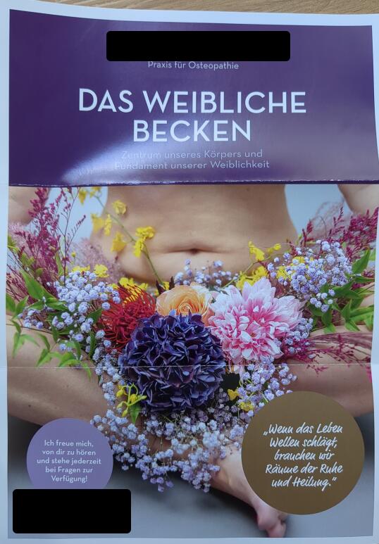 In einem Café wirbt eine Osteopatin mit ihren Schwerpunkt, dem Becken von Frauen. Privat finanziert. | |