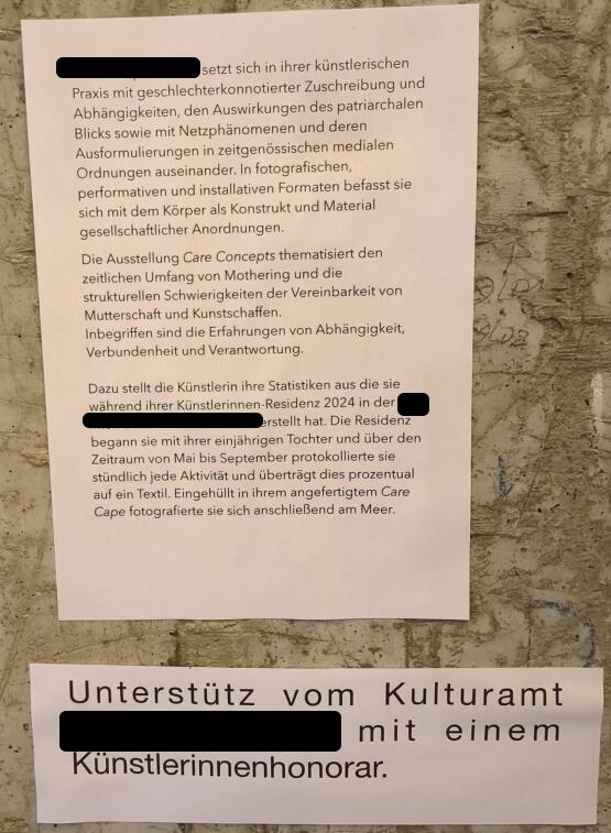 Eine Ausstellung in einem Café von einer Künstlerin, die sich ausschließlich mit Themen von Frauen, wie zum Beispiel "Mothering", beschäftigt. Die Künstlerin wurde durch ein Honorar der Kommune unterstützt. Staatlich gefördert. | |