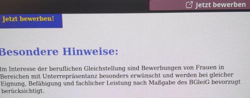 Bundesbehörden wünschen sich und bevorzugen Bewerbungen von Frauen gemäß dem Bundesgleichstellungsgesetz. Staatlich finanziert. | |