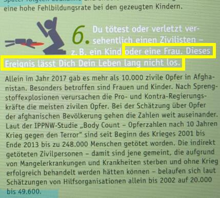 Schüler-Informationsblatt zu Risiken eines Bundeswehreinsatzes warnt: Du könntest eine Frau töten. Das würde dich ein Leben lang nicht mehr loslassen. Privat finanziert. | |