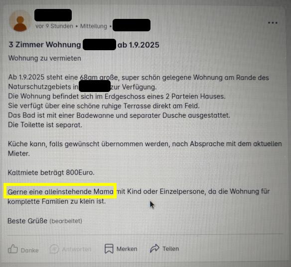 Wohnungsangebot. Die Wohnung wird gerne an eine Frau vergeben. Privat finanziert. | |