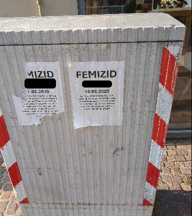 Jemand hat einen Stromkasten mit Beschreibungen von Morden an Frauen beklebt. Privat finanziert. | |